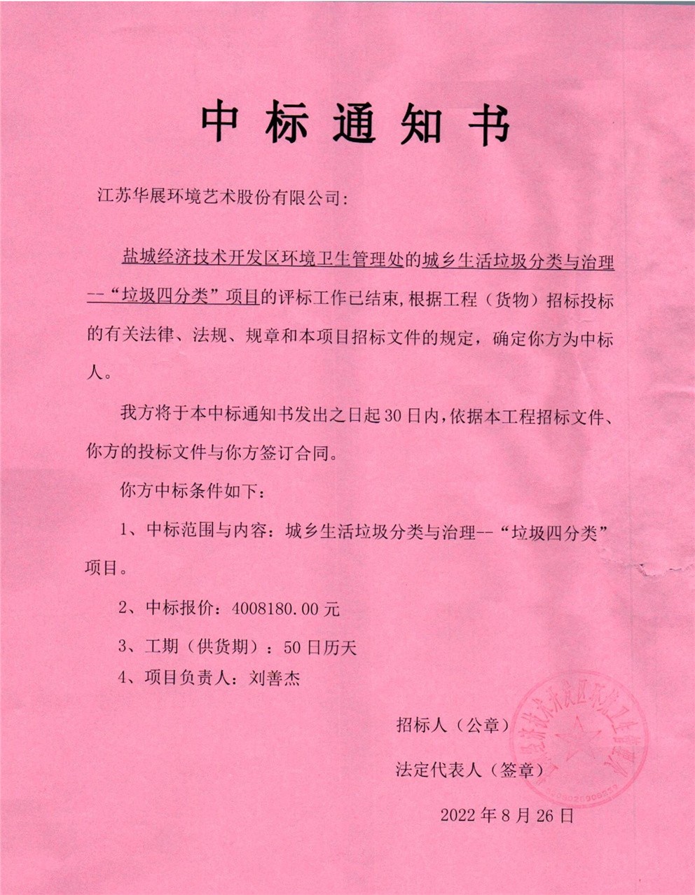 【中標通知】鹽城經濟技術開發區環境衛生管理處的城鄉生活垃圾分類與治理--“垃圾四分類”項目