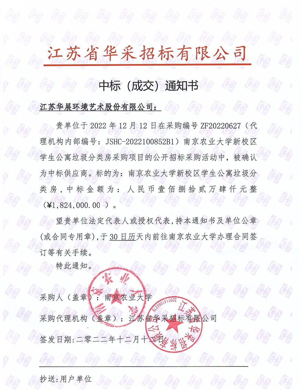 【中標通知】南京農業大學新校區學生公寓垃圾分類房采購項目