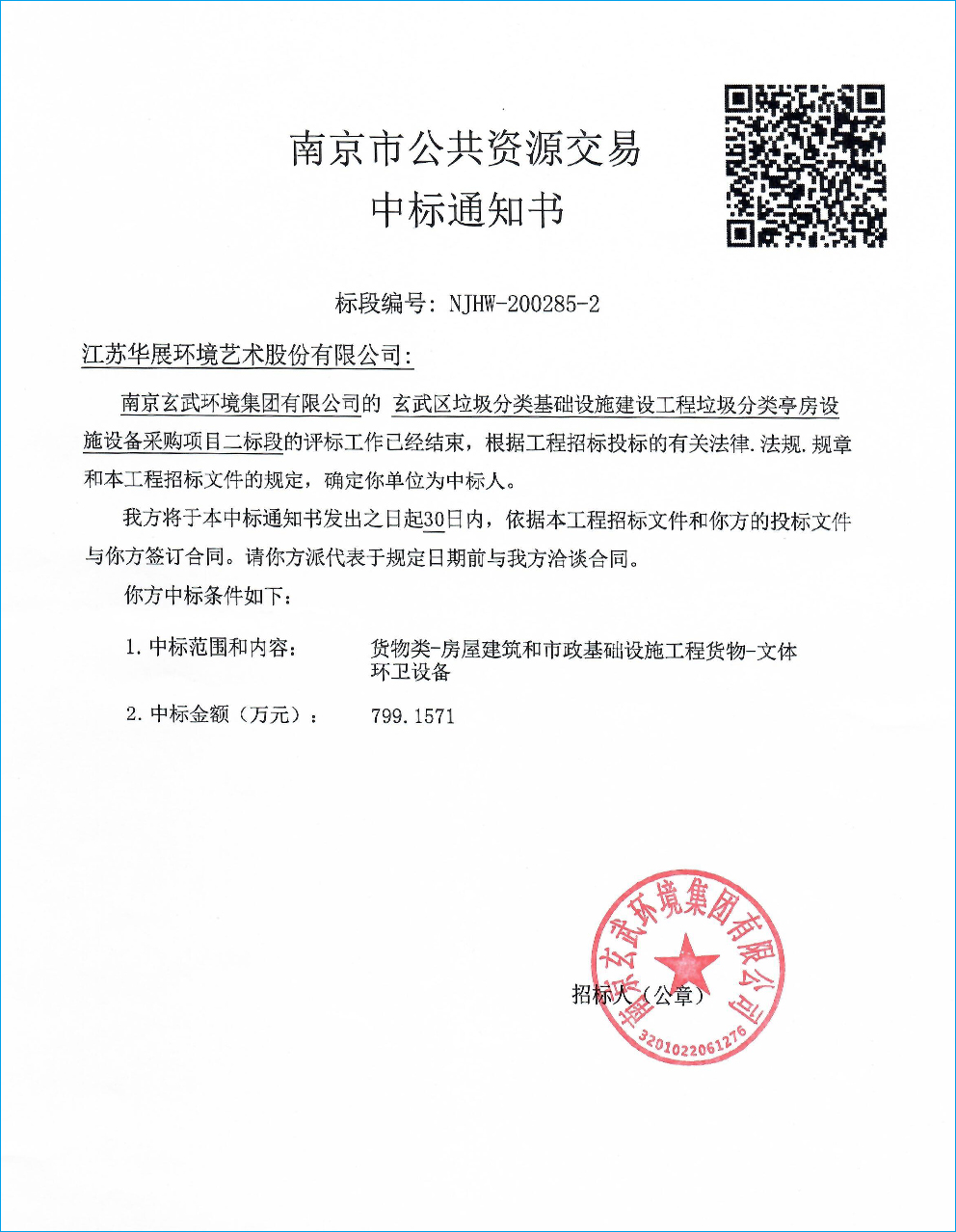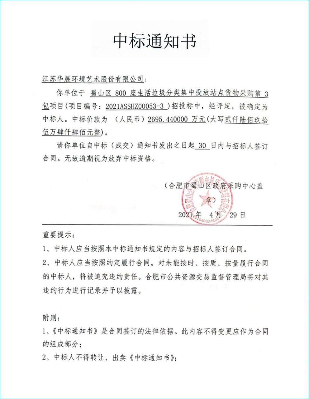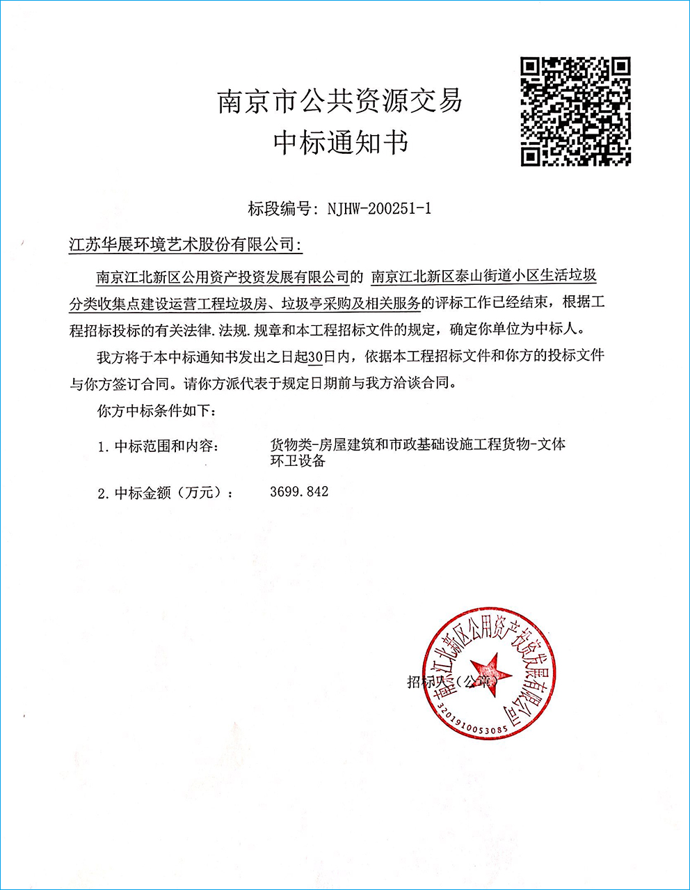 【中標(biāo)通知】江蘇省南京江北新區(qū)泰山街道小區(qū)生活垃圾分類收集點(diǎn)建設(shè)運(yùn)營(yíng)工程垃圾房、垃圾亭采購(gòu)及相關(guān)服務(wù)項(xiàng)目